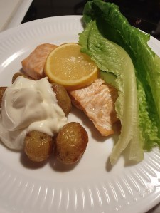 Ikväll blev det laxfilé i ugn med små delikatess potatisar, citron och lätt crème fraiche som dressing/ sås.