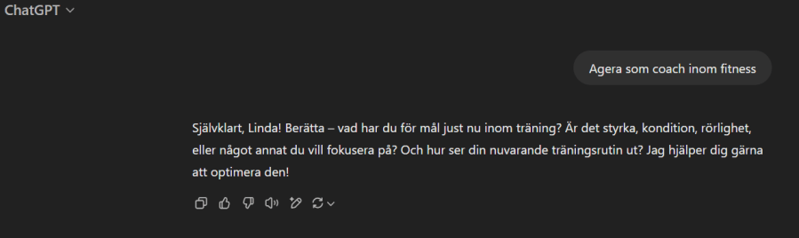 Testa själv – hur kan ChatGPT hjälpa dig idag? Skriv en fråga eller be om ett träningsprogram, så hjälper ChatGPT dig att komma igång! Tex kan du föra en konversation enligt nedan. 💪